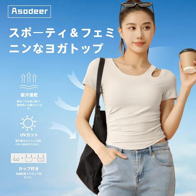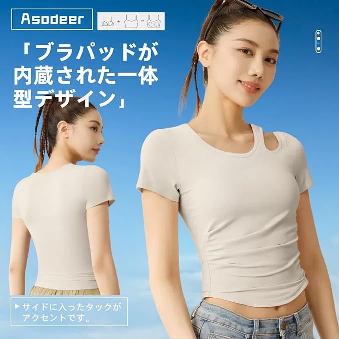 [Asodeer] ヨガウェア レディース トップス プラクティスシャツ 半袖 tシャツ アシンメトリーカッティング カップ付き 吸汗速乾 ショート丈 ストレッチ バレエ テニス フィットネス 運動用