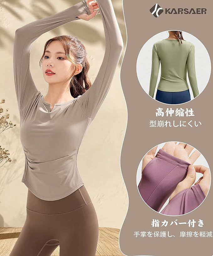 [Karsaer] ヨガウェア トップス 長袖 tシャツ レディース スポーツウェア Vネック 片側プリーツ 体形カバー ジム ピラティス トレーニング ランニング yoga 吸汗速乾 A0077