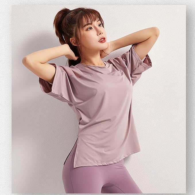[優億] スポーツシャツ ヨガウェア ゆったり トップス レディース 体型カバー Tシャツ メッシュ トレーニングウェア 半袖 スリット トップス ストレッチ 速乾 薄手 夏 ヨガウェア 冷感速乾