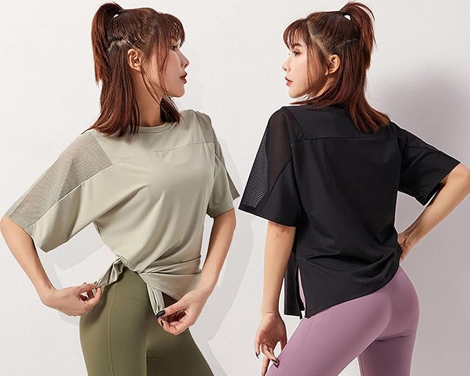 [優億] スポーツシャツ ヨガウェア ゆったり トップス レディース 体型カバー Tシャツ メッシュ トレーニングウェア 半袖 スリット トップス ストレッチ 速乾 薄手 夏 ヨガウェア 冷感速乾 | funshop