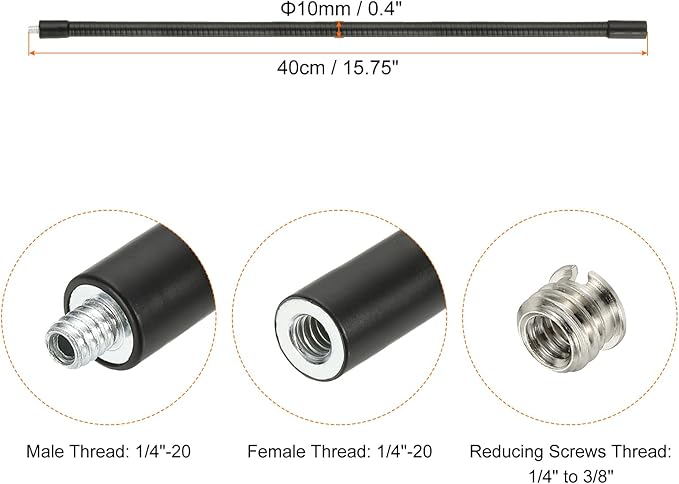 仕様: 全長: 40cm / 15.75"; 外径: 10mm / 0.39"; オススレッド: 1/4"-20; メススレッド: 1/4"-20; レッドシューズスレッド: 1/4" to 3/8" オス内部スクリュー; 素材: メタル; カラー: 黒; 梱包リスト: グースネック 1 セット (レッドシューズ 1 個含む)