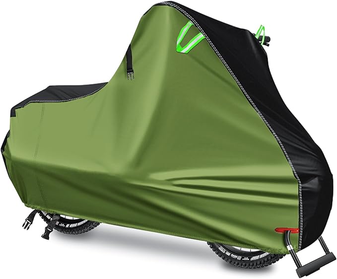自転車カバー 防水強化 300D超厚手仕様 破れ防止 盗難ロック対応 紫外線カット 風飛び防止ベルト 収納ポーチ付 反射テープ 防塵 防風 グリーン 150x85x60