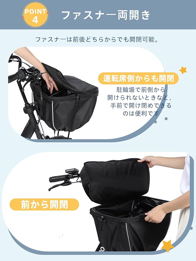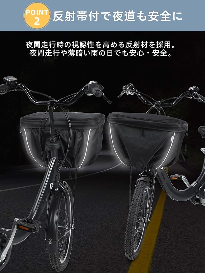 自転車 カゴカバー 前 防水 2段式 厚手 600Dナイロン 反射帯付き 撥水加工 ファスナー両開き 雨よけ 電動アシスト車対応 (11757-ブラック)