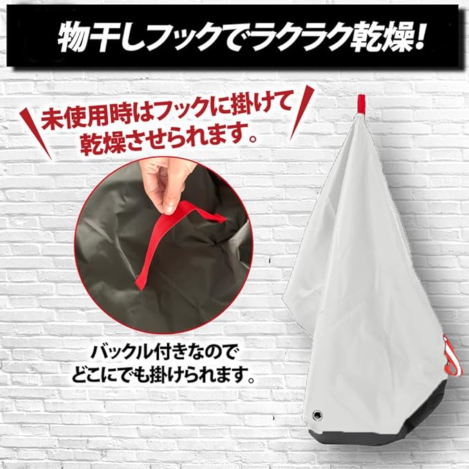 5.【防風対策】前後にはドローコード付きで自転車にかぶせた後に、コードで引き締めてしっかりと固定することができます。 またセンター部分にはバックル付きのストラップがついており、強風でもカバーがバタついたり、飛んでしまったりするのを防ぎます。