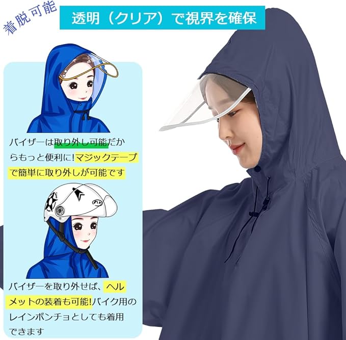 【雨の日にも安心安全】着脱可能*透明で視界良好なバイザ一が付きており、雨から視界を確保し、自転車の運転にも安心です。ポンチョだけど、袖もあります。両手の自由が利く,袖がある ので、ハンドル操作がしやすい。ロング丈で足元がすっぽり隠れて濡れにくい 。