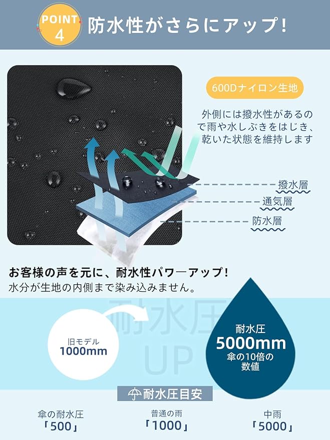 【撥水・防水加工】丈夫な600Dの生地を採用しているほか、撥水・耐水圧加工(5000mm)も施されているので、雨の日でも安心して利用できます。