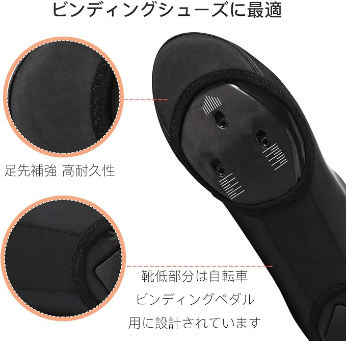 【安全設計】かかと部分には反射素材が備わっているので、夜間でもほかの車や自転車からの視認性が高く、安心して走行できます。前面部分に滑り止め加工ですので、つま先から足首まで全てを保護する。