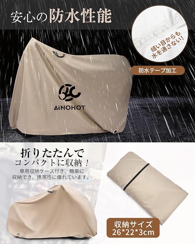 【210Dオックスフォード】210D(デニール)厚くて丈夫なオックスフォード生地を採用し、丈夫で耐久性に優れています。軽量で破れにくく頻繁に出し入れしても長く使い続けられます。また、劣化しにくい素材なので、長い期間屋外で使え、長い期間自転車を風雨から守ることができます。