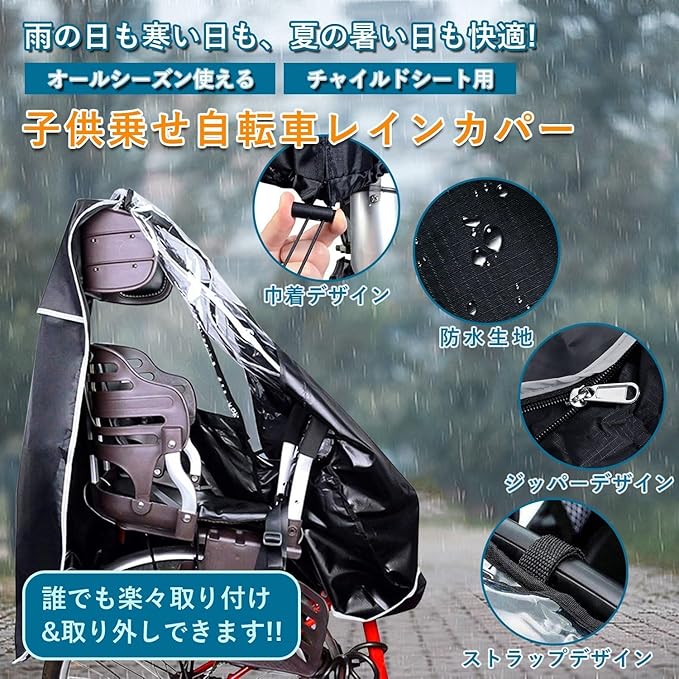 レインカバー 後ろ子乗せ用 子供乗せ自転車 チャイルドシート 雨よけ 600Dナイロン 耐久性アップ 広々空間 型崩れしにくい 乗り降り簡単 通気口あり 風防 防寒 雨よけ