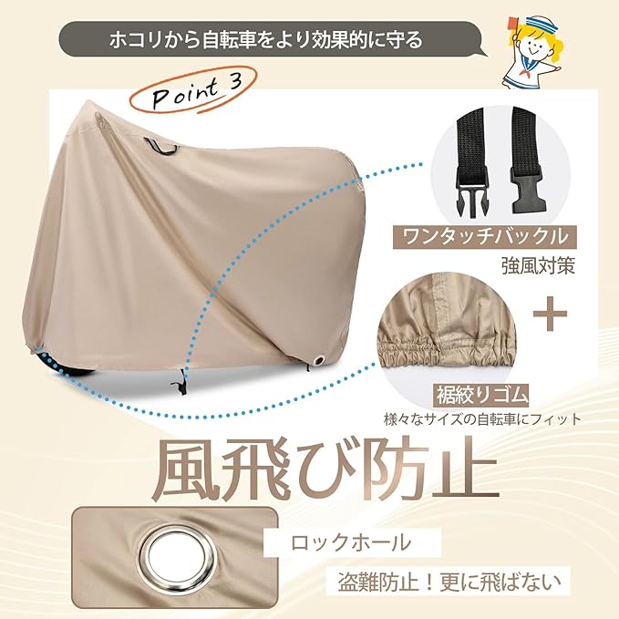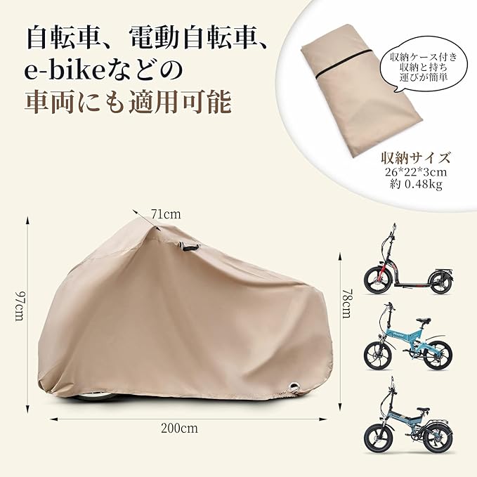 自転車カバー 防水 厚手 日焼け防止/防雪/霜防止 全被り 破れにくい 高耐久 雨避けカバー 盗難防止ロック穴付き 防風&防塵 耐熱 UVカット 電動自転車対応 210Dオックス製 バイクカバー 収納袋付き ベージュ