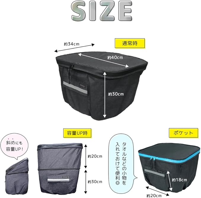 【ポケット】前部分にマジックテープで開閉するタイプ。ビニール袋やタオルなどを収納できます。「サイズ:横 約17cm 縦 約18cm」 【カバー内側】カバー内にはズレを防ぐひもが付いておりキッチリとかごと前かごカバーを繋ぎ止め固定できます。 様々な大きさのかごに対応できるようにマジックテープでかごの大きさに調整可能です。