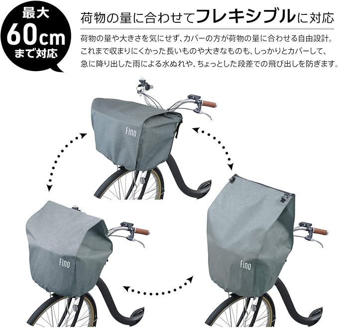 これまで収まりにくかった長いものや大きなものも、しっかりとカバーして、急に振り出した雨による水ぬれや、ちょっとした段差での飛び出しを防ぎます。最大60cmまで