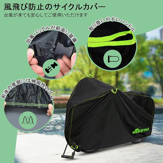 【風飛び防止機能付きサイクルカバー】前後の底部には伸縮性のゴムがついており、簡単に着脱可能。さらに、風によるズレを防ぐための調整可能な防風バックルを前面に装備。台風や強風の日でも安心してご使用いただけます。電動自転車カバーとしても安定性を保ちます。