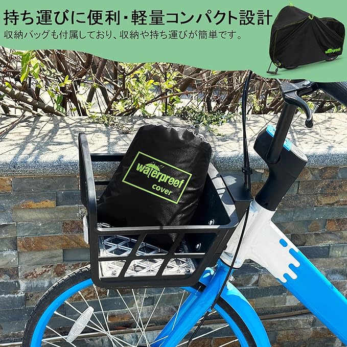 【盗難防止と収納バッグ付き】前面には布製ロック穴が装備されており、盗難の心配なく自転車を安全に保護。付属の収納バッグで簡単に収納や持ち運びが可能です。軽量設計で、どこへでも気軽に持ち運べる便利なサイクルカバーです。