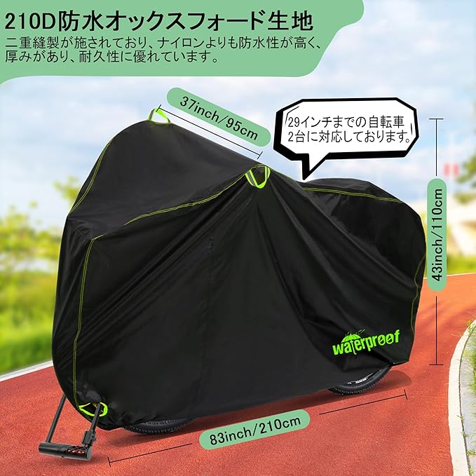 【自転車カバーとしても最適なサイズ】210*110*95cmのサイズで、自転車、マウンテンバイクなど、ほとんどの標準的な自転車2台(29インチまで対応)にぴったりです。210Dの厚手生地を使用しているため、長期間の使用にも耐える耐久性を実現しています。