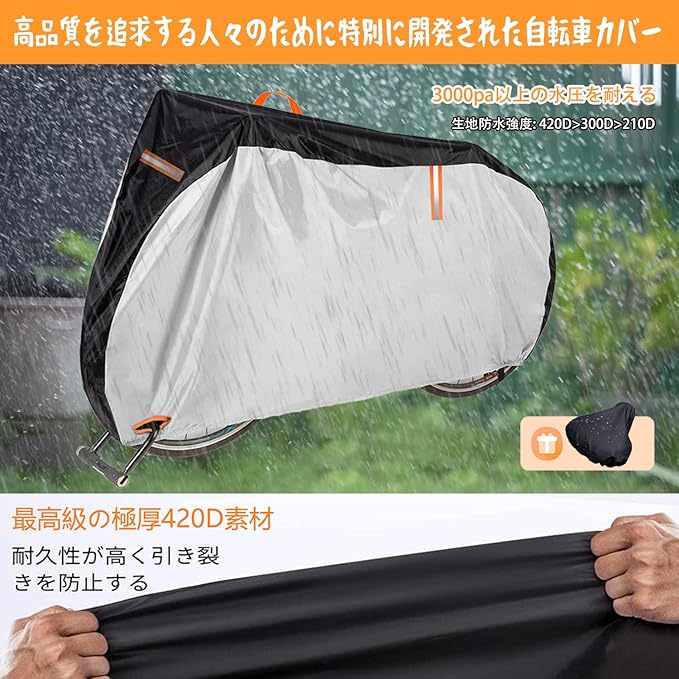 【携帯便利&反射ストライプ3枚】自転車カバーの使い安全性と便利性を考える上、収納袋が付属しているので、すっきりまとまって持ち運びやすいです。安全性のために3枚警告反射テープを追加される!夜間でも、愛車の位置が見えます。また、衝撃などの意外的な事故を発生しないように夜間駐車の安全を確保できます。