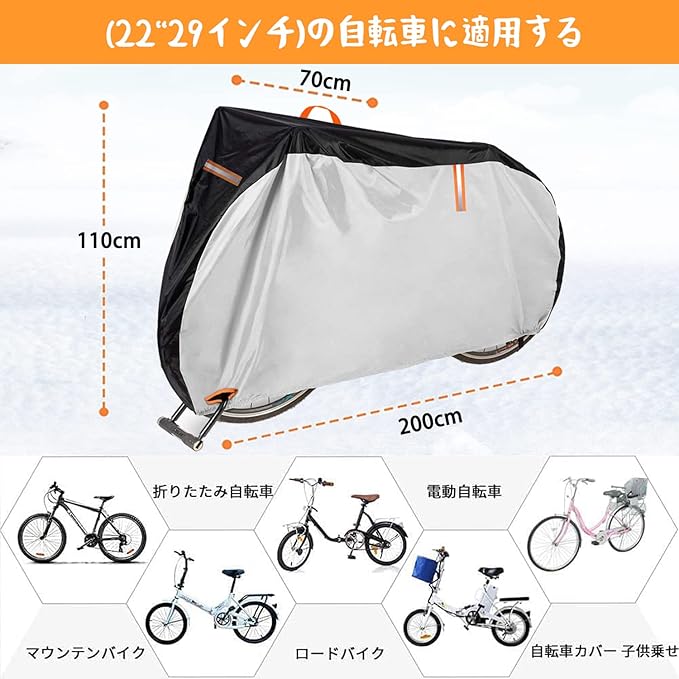 【29インチまでの車種に対応】自転車 カバー 長さ200cm 高さ110cm 幅70cm。マウンテンバイク、ロードバイク、電動自転車、自転車適用。 18inch ~ 29inchまで対応しています。 子供用椅子の付いていない普通の自転車にも装着可能です。