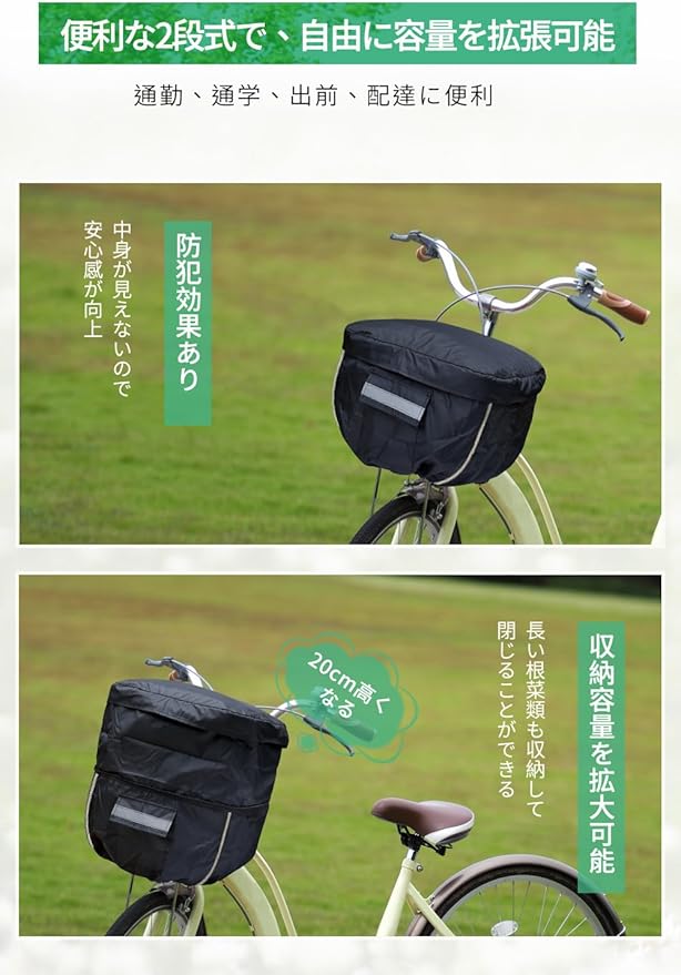 【2段式カバーなら収納の悩みが減る】自転車でスーパーに買い物に行き、1段のカバーに荷物が入りきらない時に、ファスナーを開くだけで2段式に切り替えられます。2段式だと収納できる容量が倍近くアップするので、野菜や果物などをまとめて買う時に収納の悩みがグッと減ります。2段式の自転車前かご防水カバーは、買い物に行く機会の多い主婦の方におすすめです。