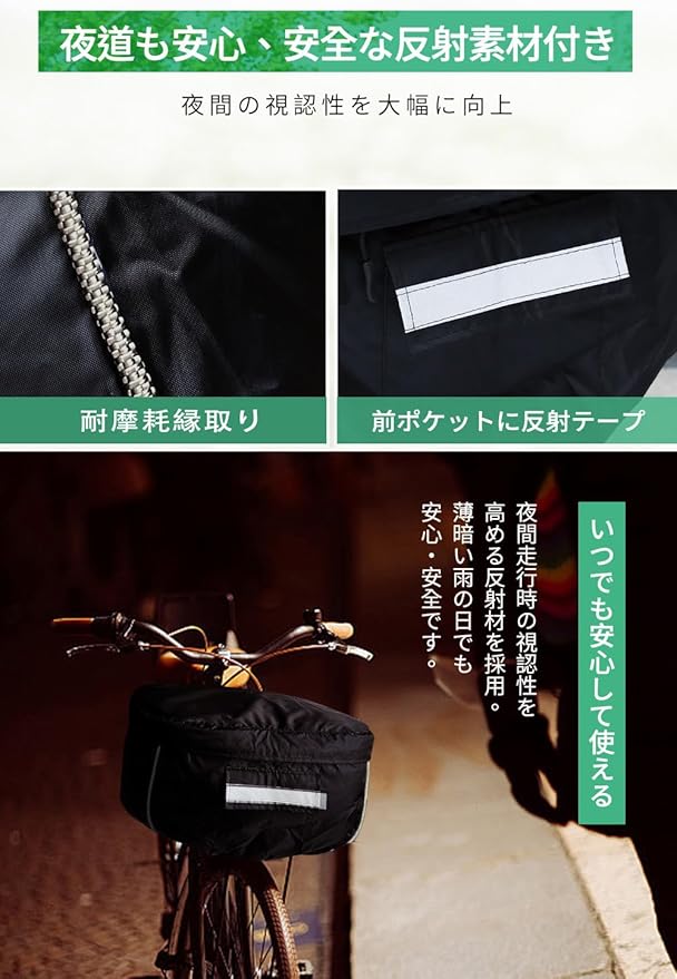 【反射帯付きなので夜道でも安全安心】この自転車まえかごカバーは車やバイクのライトに反射して光る反射帯が付いているので、暗い夜道を走行する時の安全性と安心感が大幅にアップします。