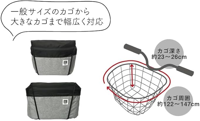サイズ 適応カゴサイズ:カゴ周囲約122~147cm以内、カゴ深さ約23~26cm 素材 ポリエステル 加工 PUコーティング(黒生地、杢生地 裏)、TPUラミネート(色生地 裏) 特徴 ・荷物の容量に合わせて容量を変更できるフロントバスケットカバー ・ボタンを外せば20センチ高くなり容量がアップ ・ハンドル側から開閉できる手前開きタイプ ・天面の芯材を前方まで配置することで容量アップした時も開閉がスムーズ ・フタに水が溜まりにくい構造 ・急な雨にも安心なはっ水加工(※完全防水ではありません。) ・バスケットの上からかぶせて裾絞りゴムで調整するだけの簡単装着 ・一般車から電動アシスト車まで幅広い車種に対応 備考 ※新聞カゴや特殊カゴには取り付けできません。