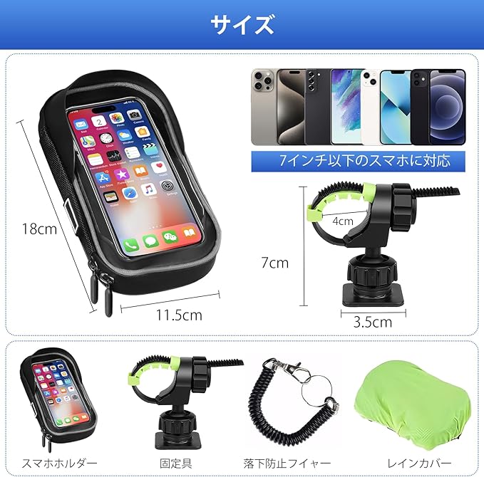 【便利セット!落下防止ワイヤー&レインカバー付き】自転車用スマホホルダーを使用する際に、最も避けたいのがスマホの落下と雨水が滲入することです。弊社は自転車バッグ専門用のレインカバーと落下防止ワイヤーもご用意しておりますので、万が一に備えて安心してお使いいただけます。使用しない時は自転車のバッグに入れて収納できます。