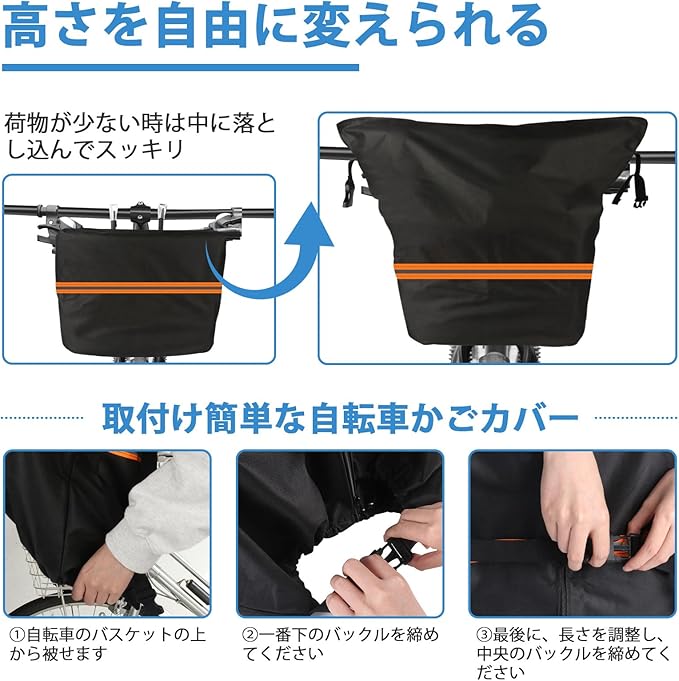 【荷物の量に合わせてサイズ調整】自由にデザインされた荷物の自転車かごカバーは、荷物のサイズや容量に合わせて調整でき、数量を気にする必要はありません。このバスケットカバーはまた、従来のカバーでは収納が難しかった長尺や大型の荷物をカバーでき、急な雨や小さな振動からこれらの荷物を守ります。