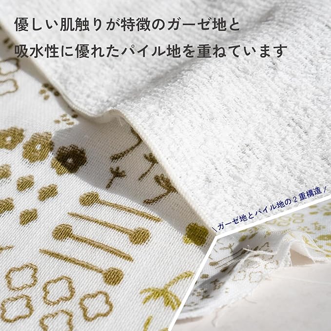 優しい肌触りが特徴のガーゼ地と吸水性に優れたパイル地を重ねています。