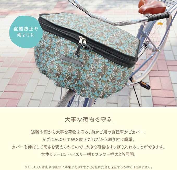 盗難や雨から大事な荷物を守る、前かご用の自転車かごカバー。かごにかぶせて紐を結ぶだけなので、取り付けも簡単です。