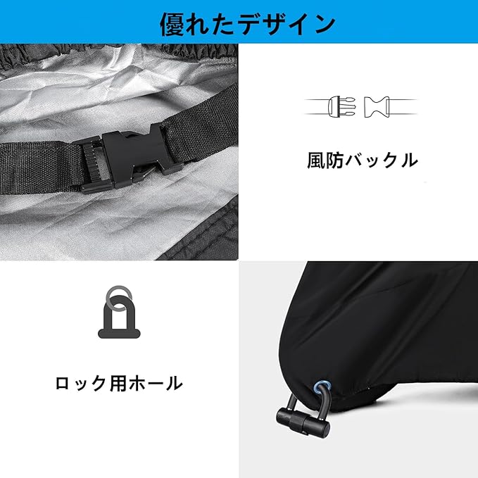 【盗難防止&風飛び防止】前部に盗難防止のリング穴がついているので、ワイヤーロックを取り付け可能です。自転車とカバーをしっかりと守ることができます。 風飛び防止のワンタッチバックル 。台風の度、買い替えの必要なし。