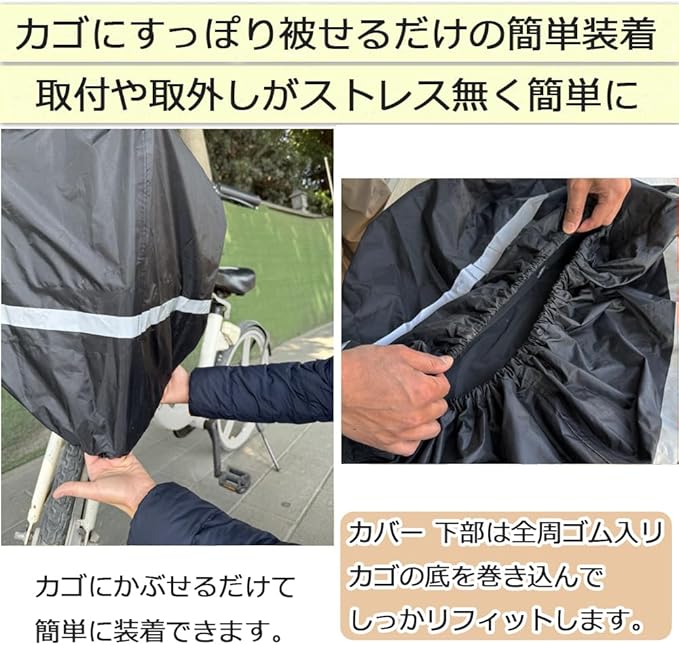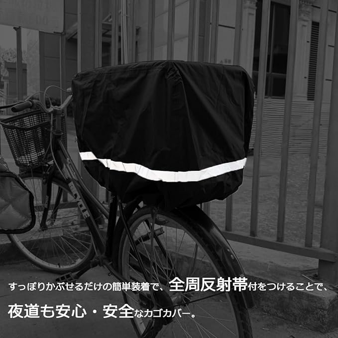 **簡単で安全な取り付け** 100%ポリエステル素材を使用し、自転車のカゴに被せるだけで簡単に取り付け可能です。取り外しもストレスなく行えます。全周に反射帯を装着しているため、夜間の走行でも安全性が高く、安心して移動できます。