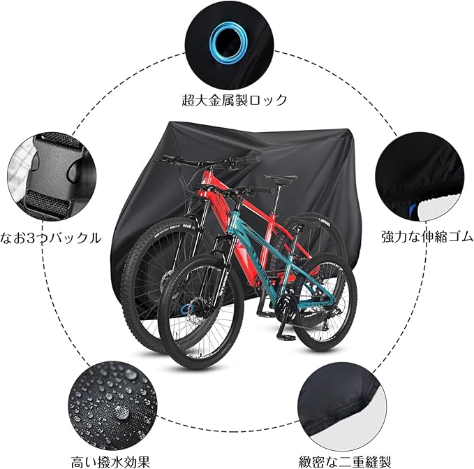 【水滴をしっかりガード・超撥水】表面にPUコーティングを施しているので撥水効果も抜群。水が入らないよう縫い目にも止水テープを施しているので、一般自転車カバーの2倍以上の撥水力を実現しました。雨 だけでなく、 雪 や 埃や汚れやサビからも自転車を守ります。(monikoの自転車カバーはご購入日からご購入日より1年間何度でも補償いたします(自己破損、経年劣化にも対応)。)