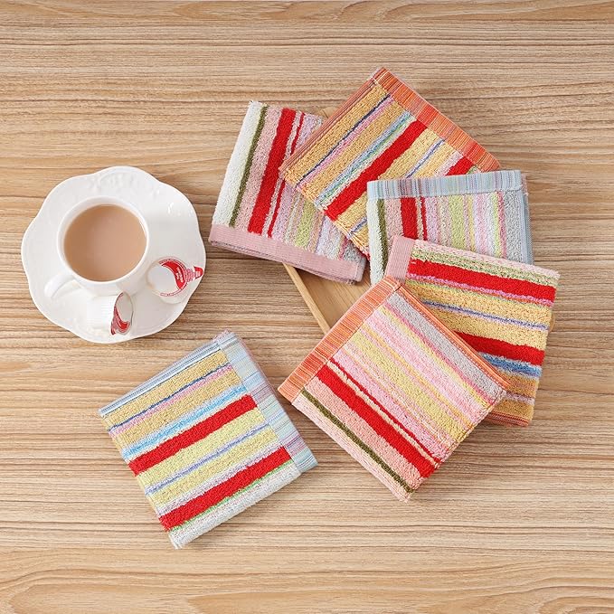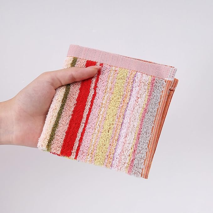 プチギフト タオルハンカチ 10枚入り 25x25cm 綿100% ハンドタオル 個包装 ラッピング付 コットン ミニタオル 色柄お任せ ふわふわ 通学 通勤 景品 プレゼント ありがとう 結婚式 退職 お返し 粗品 お礼 (レッドストライプ)