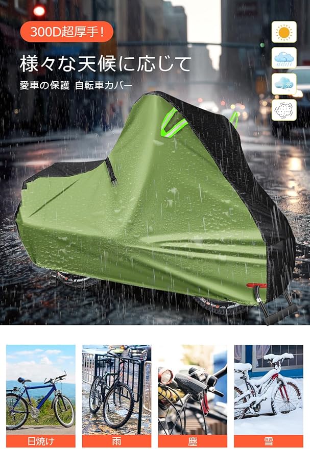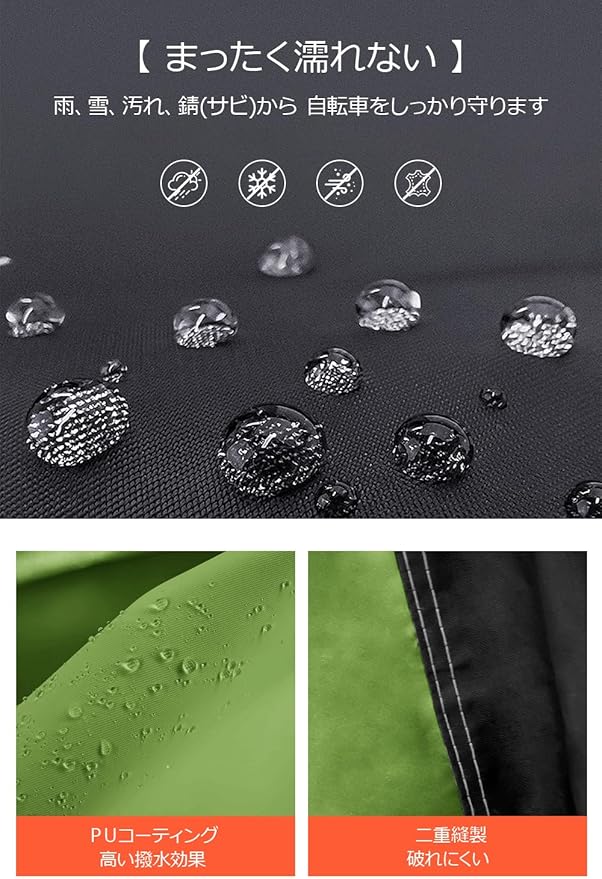【高品質の300Dオックスフォード生地で作られた自転車カバー】高品質の300Dオックスフォード防裂・耐退色生地を採用し、防水性と耐久性に優れた自転車カバーです。PUコーティング加工により高い撥水効果を実現し、雨、雪、氷、風、ほこり、直射日光など、あらゆる悪天候から自転車をしっかり保護します。さらに二重縫製加工で、長期間の使用でも破れにくく安心です。軽量設計で持ち運びも簡単、日常使いに最適です。