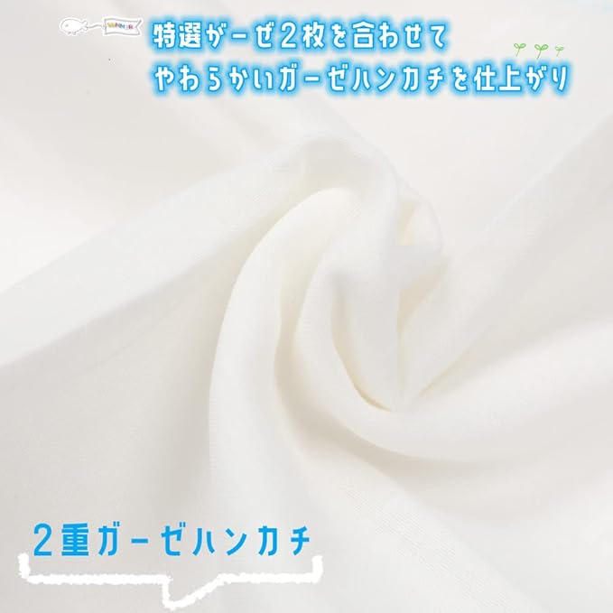 一番柔らかいガーゼハンカチ。世界中一番薄く柔らかいガーゼ生地を2枚合わせって、優しい肌触りです。洗いほど柔らかくなる。