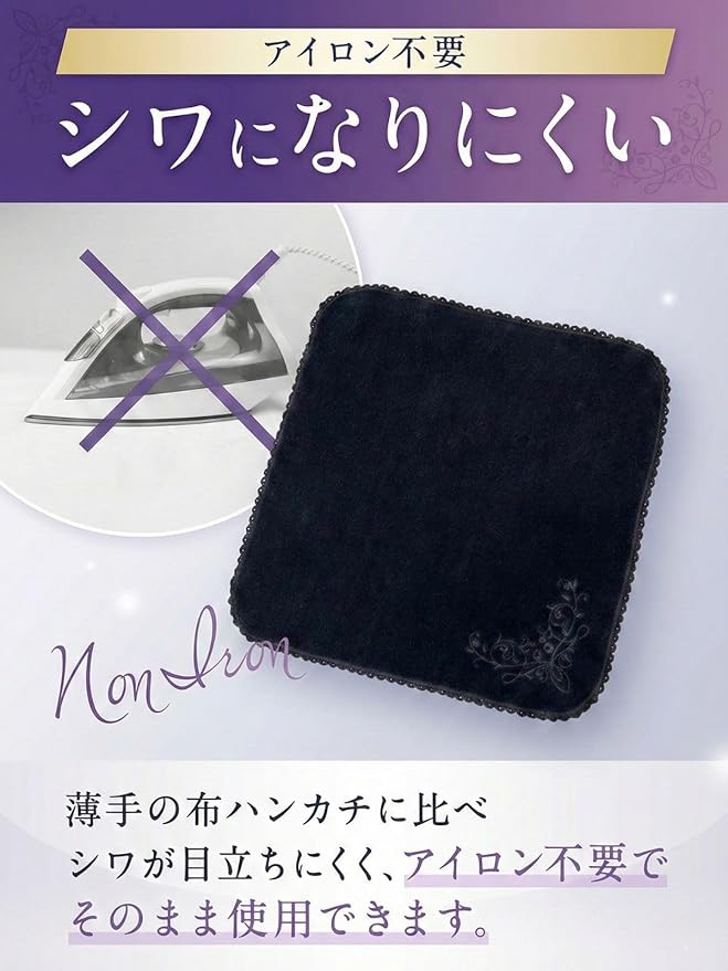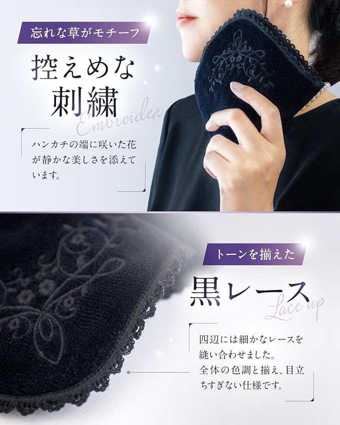 [心愛箱] ハンカチ 黒 葬式【高級ベルベット調】タオル地 レディース ブラック フォーマル 刺繍 レース 綿100% 選べる枚数 [葬儀マナーBook付属]