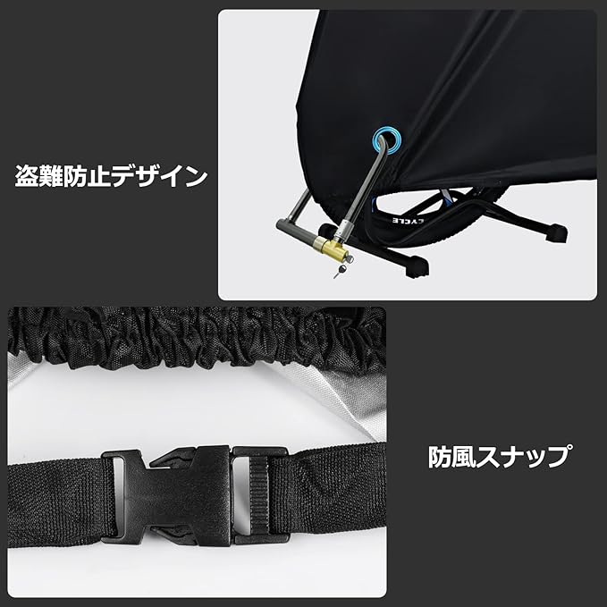 【紫外線防止&風飛び対策】自転車カバーの内側には、強い紫外線による自転車の劣化を防ぐためのシルバーコーティングが施されています。前後の裾は伸縮性のあるゴム仕様で、風が吹いてもフィットします。バックルを結ぶことで、強風の天候でもカバーが自転車をしっかりとカバーすることができます。