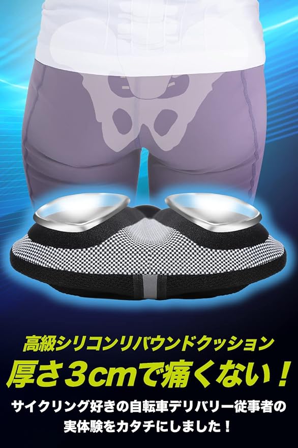 高品質のシリコン素材を採用し、厚さ3cmの低反発リバウンドクッションがお尻に与える衝撃を緩和します!前傾姿勢で自転車をこぎ続けると痛くなる股間部分の前部を、肉厚シリコンが高いクッション性を維持し、柔らかい着座感をさせ、お尻にかかる負担を大幅に軽減します。長距離サイクリングの快適さを保証する【サドル クッション】です!