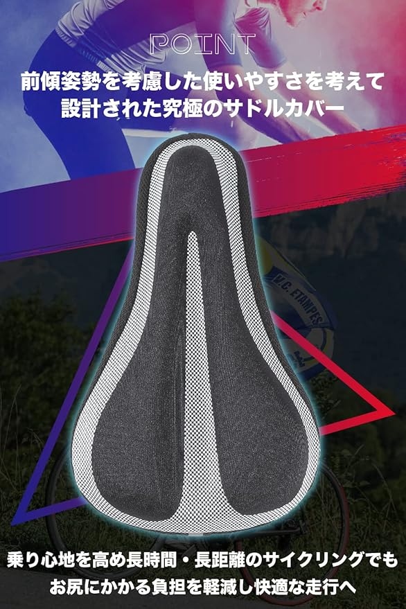 お尻の痛みからサイクリストを守る至極のサドルカバーをサイクリング好きの自転車デリバリー従事者が特別に考案しました!自転車に乗っていた当日のみならず、翌日まで引きずることが多い股間やお尻の痛みをワンタッチで軽減できるスグレモノです。クロスバイク、ロードバイク、マウンテンバイク等、様々な自転車に適合しておりサドルが小さい折り畳み自転車にも適しています。【サドルカバー 痛くない】というコンセプトをカタチにしました!