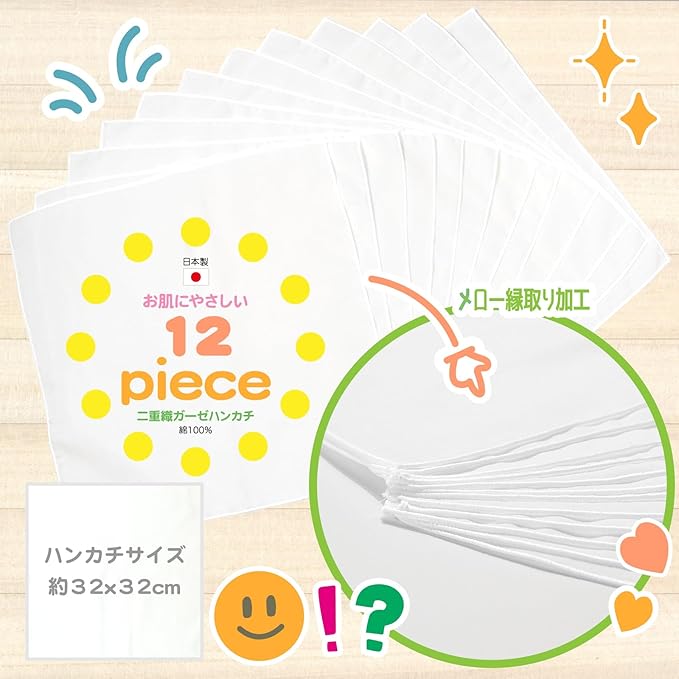 [クラスタ]【12piece】 ガーゼ ハンカチ 12枚 セット綿100% メロー縫製 日本製 ホワイト 二重織 ガーゼ生地 赤ちゃん ベビー用 出産準備 お口拭き よだれふき 沐浴ガーゼ 無蛍光 無塩素加工 学校用 幼稚園