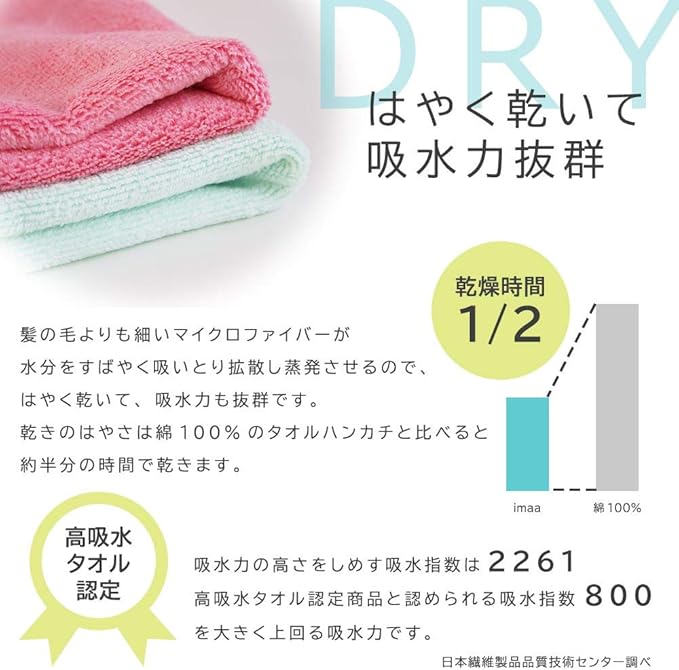 髪の毛よりも細いマイクロファイバーが、水分をすばやく吸いとり拡散し蒸発させるので、はやく乾いて、吸水力も抜群です。