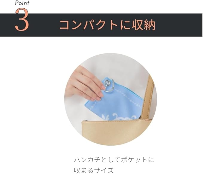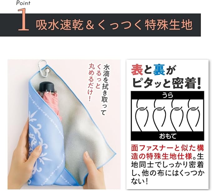 【吸水速乾&くっつく特殊構造】表と裏がぴったりくっつく特殊生地で、傘やペットボトルを簡単に包めます。優れた吸水性と速乾性で、外出先でも水滴や湿気をすばやく吸収。バッグの中身や持ち物を濡らさず、スマートに持ち運べます。