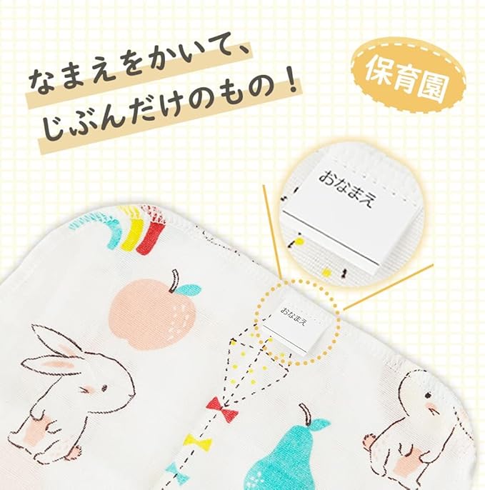 [名前付き]名前が書ける便利なタブ付き、幼稚園や保育園などで自分のタオルを見つけやすく、なくす心配もありません。
