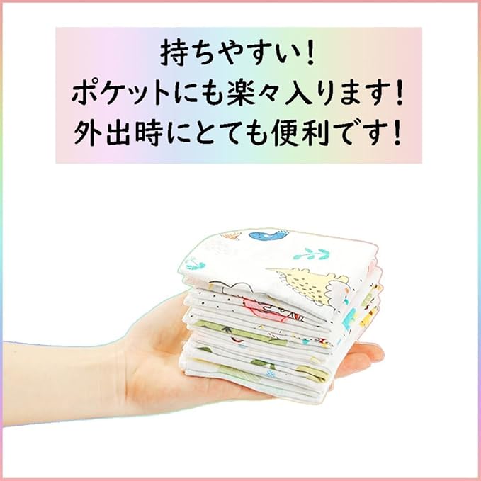 持ちやすい!20cmX20cm、畳んでもかさばらなくて、収納はもちろん、 お子様との外出の持ち運びタオルとしても大助かり!