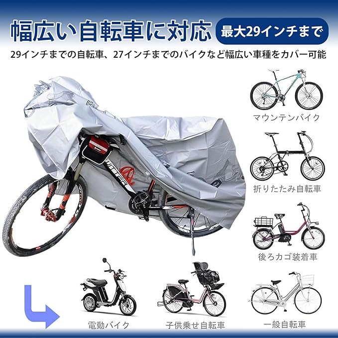 【29インチまでの車種に対応】もし大雨、雪、ほこり、切れ目や日射によりの損害にお金の無駄使いをしたくない場合、大切な自転車をどのように保護するかを知らなければなりません。Favuit自転車カバーはあなたの自転車に優れている室内保護?アウトドアの保護を提供いたします。 マウンテンバイク、ロードバイク、電動自転車、原付も適用。 18inch ~ 29inchまで対応しています。 子供用椅子の付いていない普通の自転車にも装着可能です。