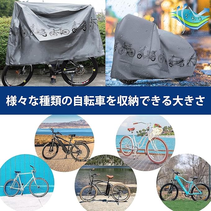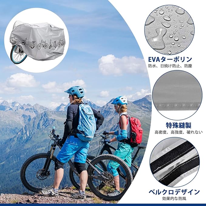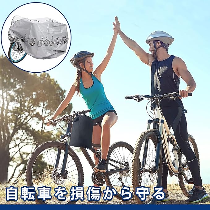 【高い撥水効果&UV加工】撥水加工の効果は通常の2倍、40+UVカットとシルバーコーティングでカバーや自転車本体の劣化の原因となる紫外線を反射して大幅にカットします。UV加工を施している自転車かばーで、より強い糸を使用しているため紫外線にも強く、しっかりと自転車を守ってくれます。それに、風の侵入を防ぎバタつきを抑え、雨、雪、ほこり、ゴミ、摩擦などから最小限に抑えることができます。