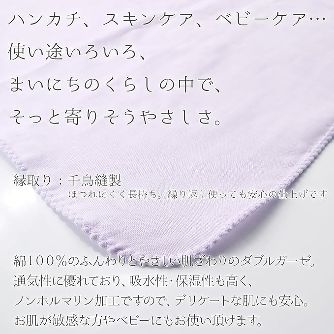 肌へのやさしさ:ノンホルマリン加工で敏感肌やベビーにも安心。ハンカチとして外出時の手拭きや汗拭きに便利。