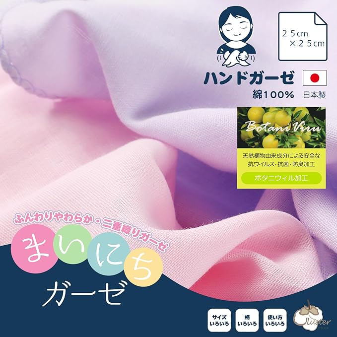 手ふきや汗ふき、外出時のハンカチとして使いやすい「cluster まいにちガーゼ ハンドガーゼ」。 日本製・綿100%の二重織りガーゼで、ふんわり軽く吸水性抜群。 グレープフルーツ種子由来のボタニウィル加工により、抗菌・防臭・抗ウイルス効果が続きます。 ノンホルマリン仕様で敏感肌やお子さまにも安心。毎日の衛生習慣に欠かせない、清潔で使いやすいガーゼハンカチです。