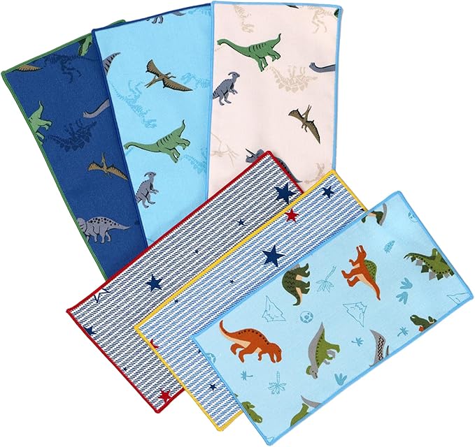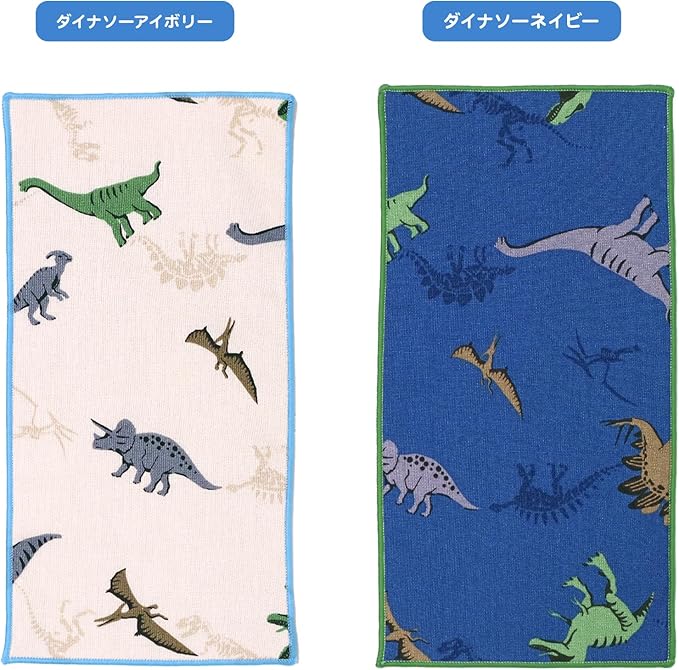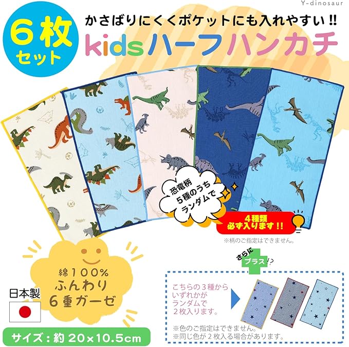 【キッズハーフハンカチ6枚/Y-ダイナソーセット】恐竜柄5種(ダイナソー水色・ダイナソーアイボリー・ダイナソーネイビー・恐竜ちゃんアイボリー・恐竜ちゃんブルー)のうちランダムで4種+ストライプスター3色のうちランダムで2枚