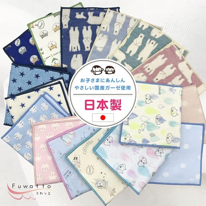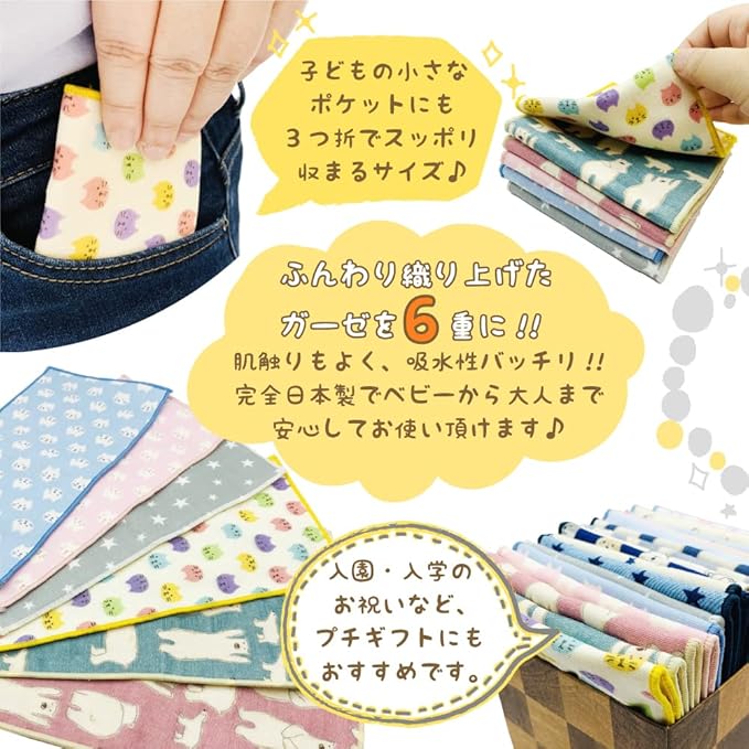 完全日本製でお子様にも安心のガーゼハンカチ 。 新入園、新入学のお祝いにもぴったり! 毎日選ぶのが楽しくなる♪かわいいアニマル柄や星柄、ストライプなど、 キッズ向けハーフハンカチアソートセット。