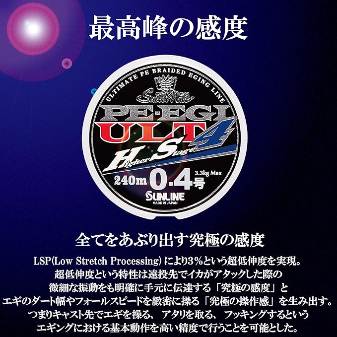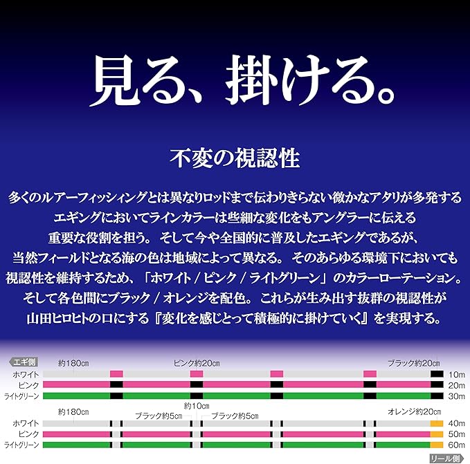 従来の4ブレイドのラインと比べ耐摩耗性が上がり、ハードジャークやファイト時、ガイドとの摩擦や浮遊物などに接触しても安心してやり取りを楽しむ事が出来ます。もちろん強力も高いので多少無理をしても問題なく使用可能です。高発色で視認性が良いカラーマークにより、イカパンチの変化を見逃さずフッキングに持ち込めます。